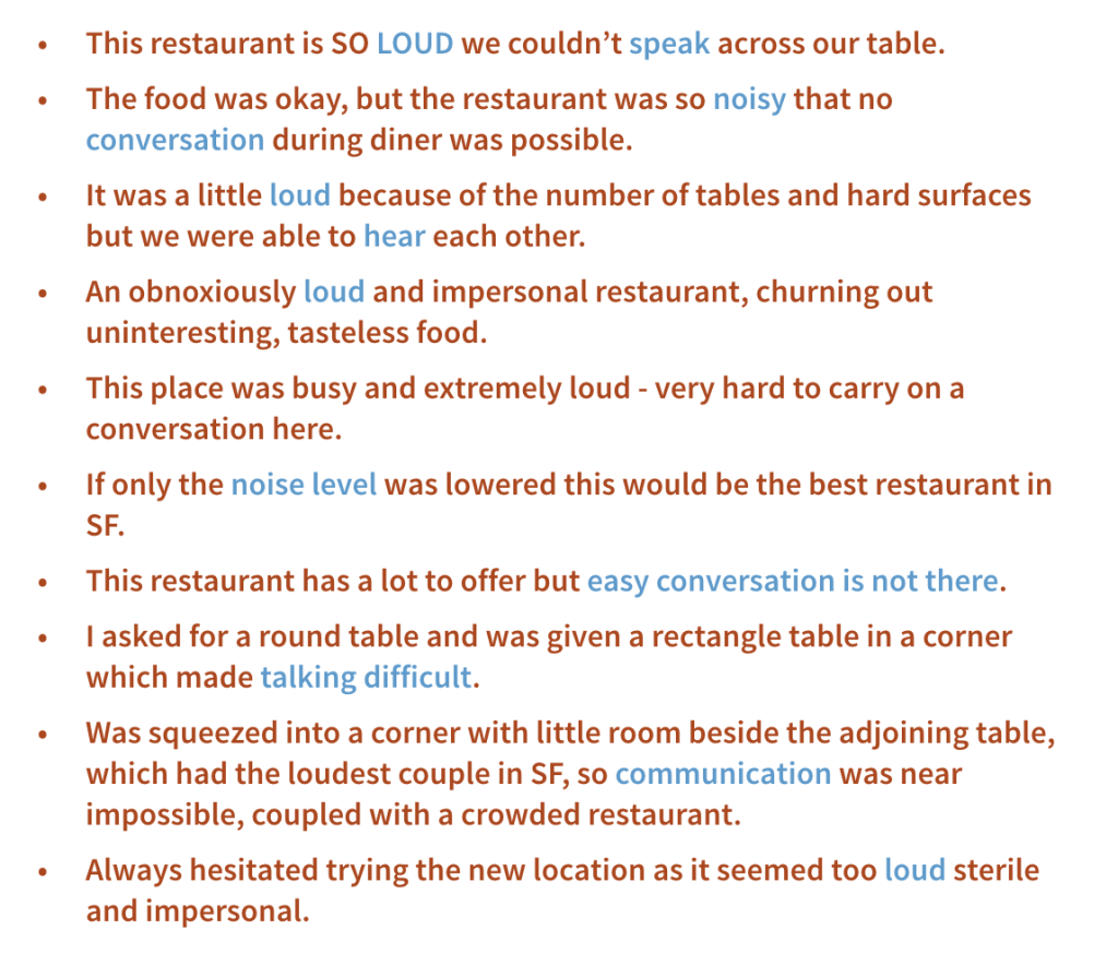 To explore to what extend WMD can be applied to such a use case, we ran Word2Vec on about 5 million of our reviews, and then picked one restaurant and generated the WMD distance matrix for all its reviews. Then we picked a sentence that expresses a certain concept and found all sentences closest to it. Below is an example of this approach at work, looking at reviews for a restaurant which might have noise issues.
