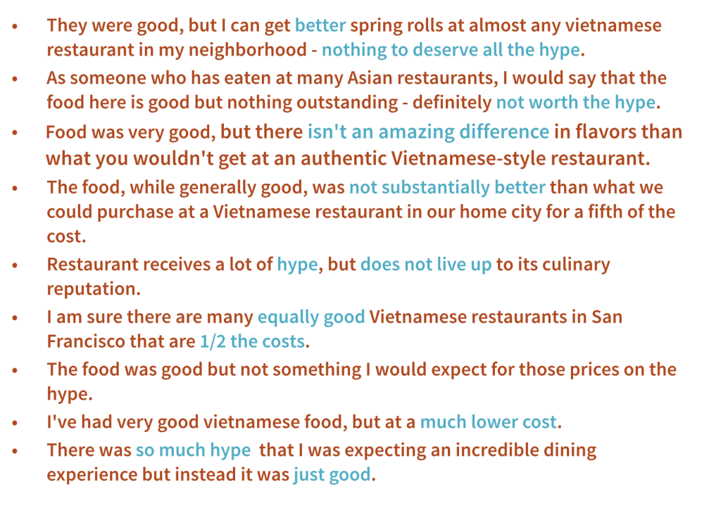 Here is another example, where people are talking about the restaurant not living up to the hype: