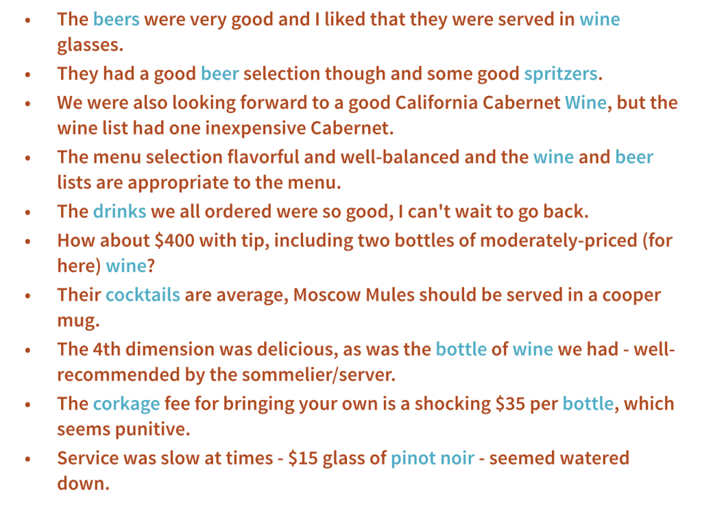 At OpenTable, the reviews left by diners are usually rich, and touch upon many aspects of the dining experience: Food, service, ambiance, and more. Sometimes, prospective diners would scan through the reviews to look for all mentions of one aspect. For example, if the restaurant has a slightly lower than average rating on service, diners would go through the reviews trying to find the common thread of why the service was rated low. If the restaurant is getting rave reviews for, say, cocktails, the potential diner would like to only scan for sentences that mention cocktails.