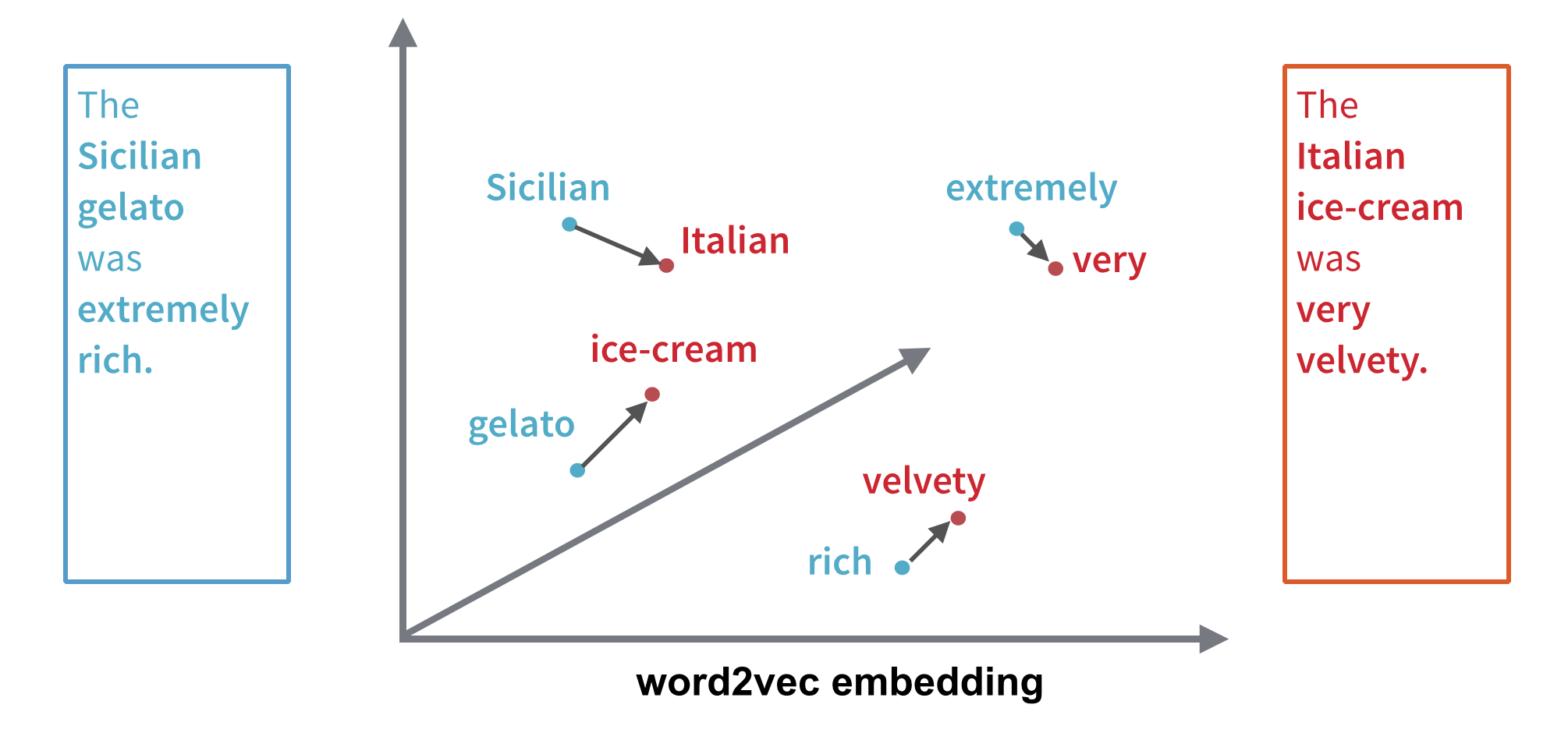 Word2Vec also brings word-vectors that are semantically synonymous close to each other in the embedding space. For instance, if we started with vec(Italian) and looked for the vectors nearest to it, we would find vec(Sicilian) close by. Similarly, the vectors for gelato and ice-cream are going to be close to each other. So going back to the two sentences above, using Word2Vec distances between words, we could teach a machine that these two sentences are semantically related. That is exactly what the WMD algorithm sets out to do. Schematically, this is how the machine learns how the two sentences about gelato are connected: