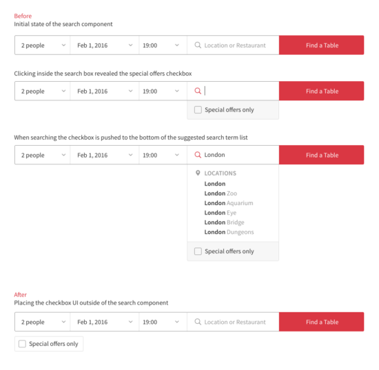 One of the initial tests we ran was to move a ‘search for offers only’ checkbox outside of the search field rather than clicking in the search field to reveal the checkbox. It felt logical: the two elements perform different functions and aren’t related – so by hiding one within the other was unintuitive. By exposing the functionality we increase the ability for users to engage with it, which hopefully delights our users when they find a deal they didn’t set out intentionally to find.