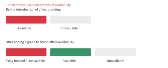 Beware of adding additional colours – it can change the user’s perception of how your site functions. In one of our tests we looked at allocating a specific colour for offers (green) to make it more visible but once applied, it made users feel that only offers were available and other time slots were unavailable: