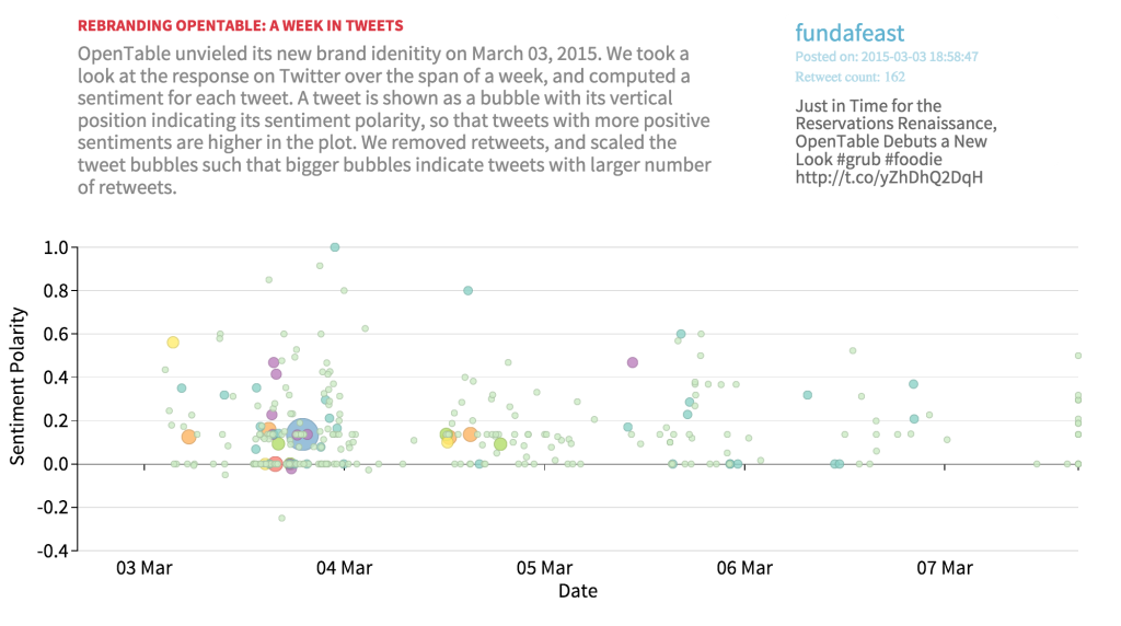 While waiting for a hyper-parameter tuning run to finish, I did a quick exploration on how OpenTable’s “brand new brand” was received on the Twitterverse. Pulling up a few lightweight Python tools, I conducted a simplistic sentiment analysis on one week’s worth of tweets related to OpenTable rebrand event, then visualized the results using dimple.js